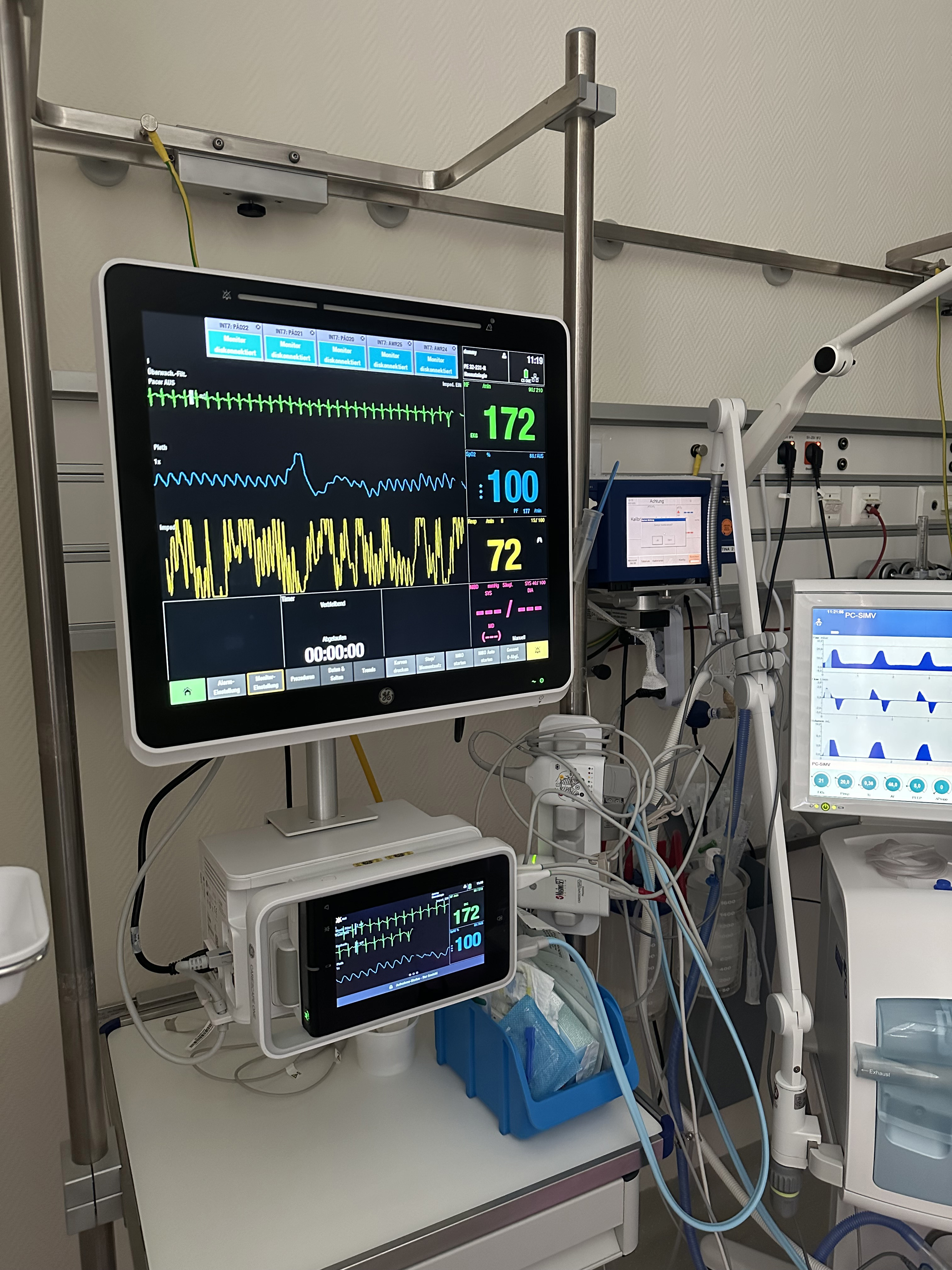 Jeder der insgesamt vier Intensivüberwachungs- und Therapieplätze verfügt über einen Monitor. Darüber hinaus lassen sich die Werte aller Plätze über zwei Zentralen im Schwestern- bzw. Intensivzimmer jederzeit auf einen Blick und lückenlos überwachen. Dabei werden die Werte für 72 Stunden gespeichert und danach überschrieben; parallel erfolgt eine durchgehende Dokumentation der Ergebnisse durch das neonatologische Team.
