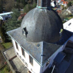 - Erhebliche Feuchteschäden erfordern kompletten Rückbau und Neueindeckung der denkmalgeschützten altdeutschen Schiefereindeckung inklusive Erneuerung der Dachbodenschalung und -dämmung