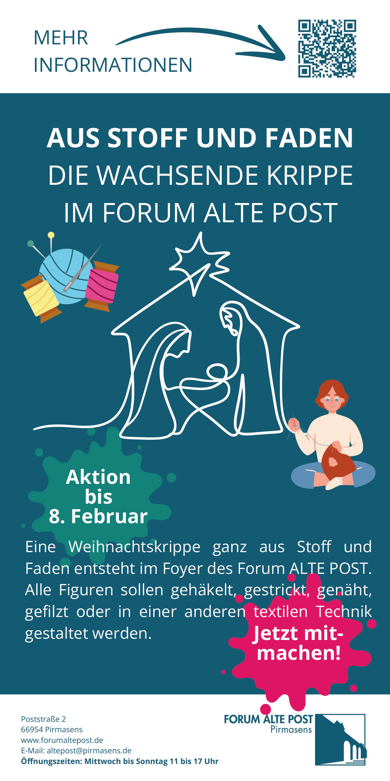 Im Foyer soll im Laufe der Ausstellung eine Krippe entstehen. Das Besondere: Alle Figuren werden textil gestaltet – egal ob gehäkelt, gestrickt, genäht oder gefilzt. Dabei brauchen wir Hilfe! Handarbeit-Fans bringen ihre gestaltete Krippenfigur mit ins Forum ALTE POST – egal ob Maria, Esel, Engel, Stern, Schaf oder Hirte. So wird ihre Handarbeit Teil der „wachsenden Krippe“.
