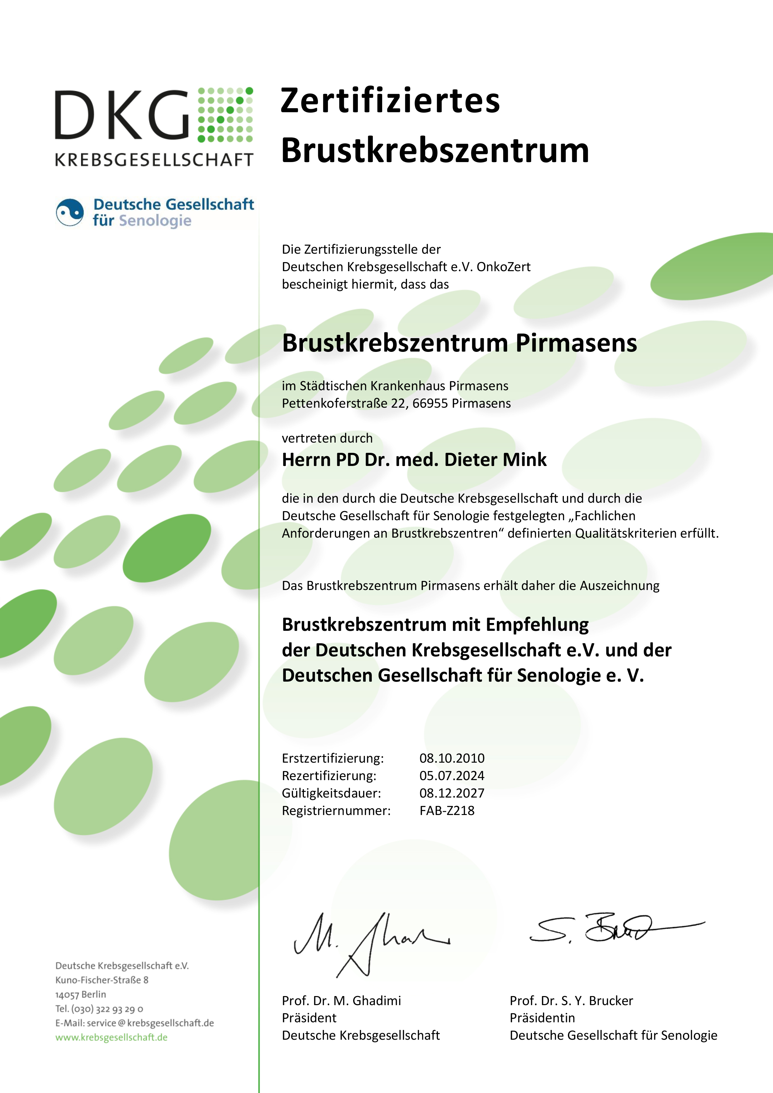 Zertifizierte Brustzentren beraten und betreuen Frauen umfassend zur Brustgesundheit; sie decken das komplette Spektrum der Früherkennung, histologischen Abklärung, Operation und Nachbehandlung des Brustkrebses ab. Dabei gewährleisten interdisziplinäre Teams aus Gynäkologie, Chirurgie, Onkologie, Radiologie, Pathologie und Strahlentherapie eine Diagnostik und Therapie nach hohen Qualitätsstandards. Bereits seit 2010 verfügt das Städtische Krankenhaus Pirmasens über ein Brustzentrum, das von der Deutschen Krebsgesellschaft regelmäßig überprüft und rezertifiziert wird; seither wurden dort rund 2.000 Patientinnen behandelt.